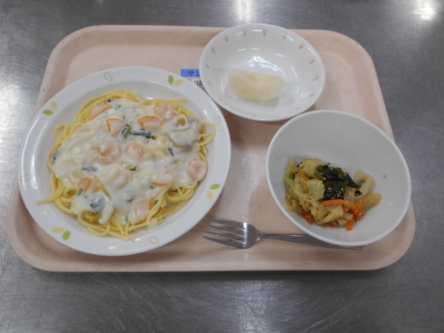【献立】 牛乳 スパゲティえびクリームソース わかめサラダ 梨