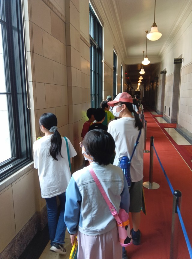 国会議事堂参議院の見学が終わりました。議場では、参議院と衆議院の違いや議場のつくり、歴史などの話を聞きました。子どもたちは、見学しながら天井の高さや控室の多さに驚いたり、中央広間の銅像を興味深く見たりしていました。