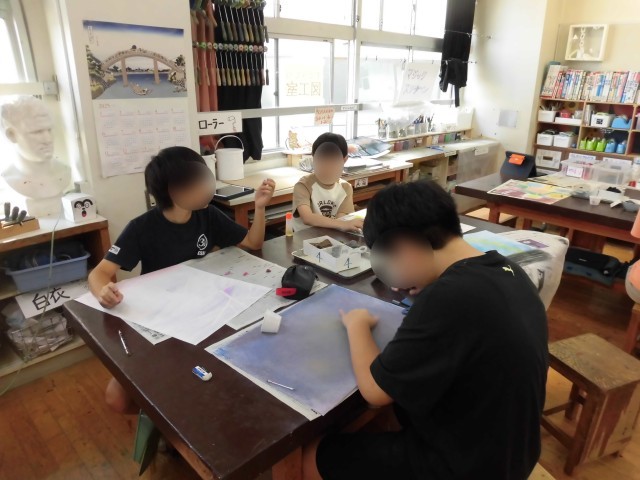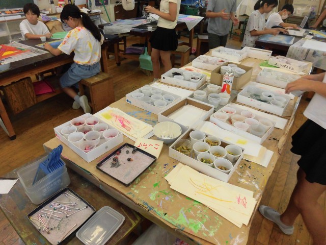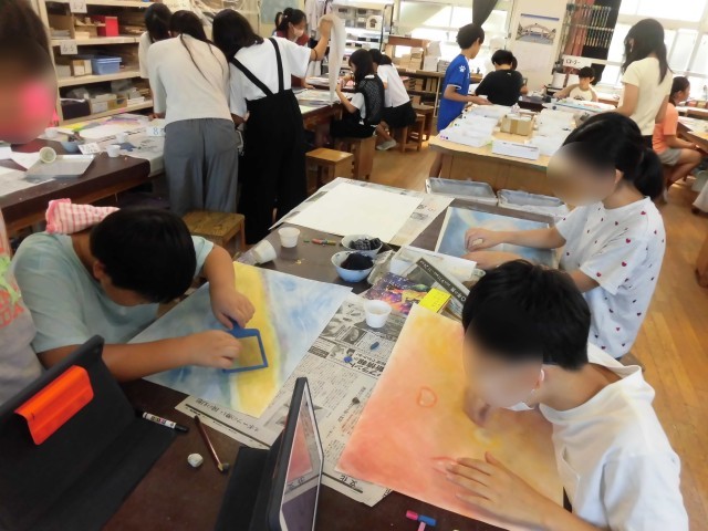 6年生の図工では「いのちのカタチ」の作品の完成が近づいています。大きな画用紙に、コンテパステルをつかって、自分を表す形や色を表現しています。コンテパステルを指でこすったり、消しゴムや網など、様々な道具を使って模様を描き、自分を表現することができました。先生に表現方法を相談しながら仕上げていく様子も見られました。真剣なまなざしで作品と向き合い、取り組むことができました。