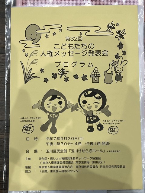 「こどもたちの人権メッセージ発表会」が玉川区民会館「玉川せせらぎホール」で開かれました。都内小学校の4〜6年生の代表の子どもたちが発表しました。「十人十色、みんなちがって、みんないい」「あいさつ、個性の大切さ」「やってはいけない差別」「いじめのない世界」など、いろいろなテーマで発表してくれました。「多様性を尊重しよう」「個性は世界でたった一つのもの」といった言葉が心に残り、改めて人権について考える機会になりました。