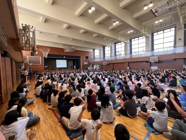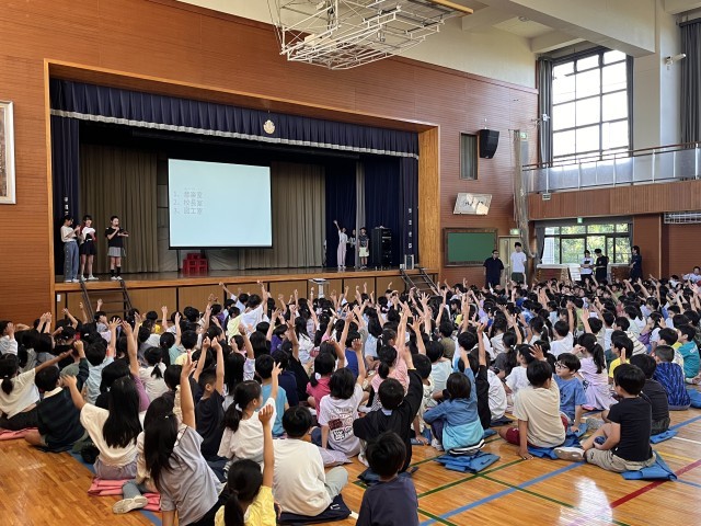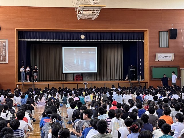 児童集会では全校の子どもたちが体育館に集まり、クイズを楽しみました。集会委員会のみなさんが考えてくれた学校の「どこか」を写真を見て当てる3択クイズです。写真が加工されているので、よく見ないと答えが分かりません。学校のいろいろな場所を取り上げてクイズにしてくれました。集会委員の最後の言葉では、「学校の知らなかった場所を見付けてみんなで伝え合ってくださいね」を話してくれました。まだまだ知らない明正小の素敵な場所を見付けてほしいと感じました。集会が終わった後も、集会委員会のみなさんは集まり、反省をして次回のめあてを決めていました。もっとみんなが楽しめる集会にしてくれるそうです。期待「大」です。