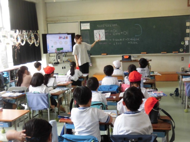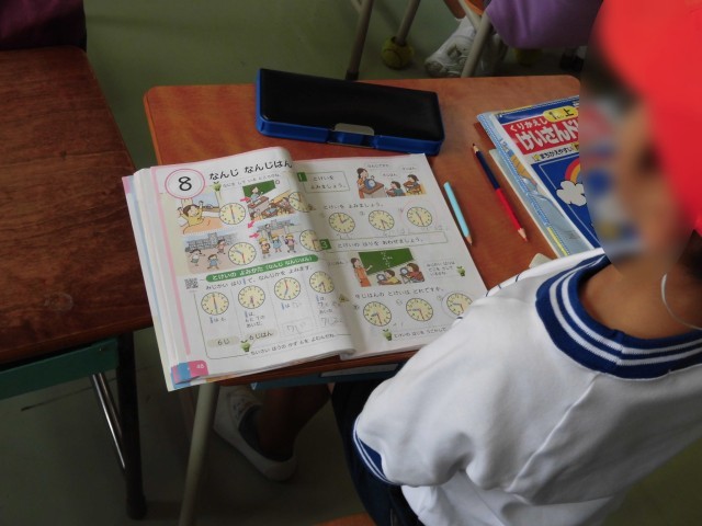 1年生の算数では「なんじなんふん」で時計の読み方の学習をしています。模型の時計も使いながら、時計を見て「何時」や「何時半」を読む練習をしました。時計の短い針と長い針がそれぞれ示す時刻と、それぞれの針がどのように関係しているのか理解できました。また、日常生活と結びつけて時刻を読むことができるように練習しました。「難しいな~」という声も聞こえてきましたが、一生懸命に真剣に取り組み、積極的に手を挙げる様子が見られました。