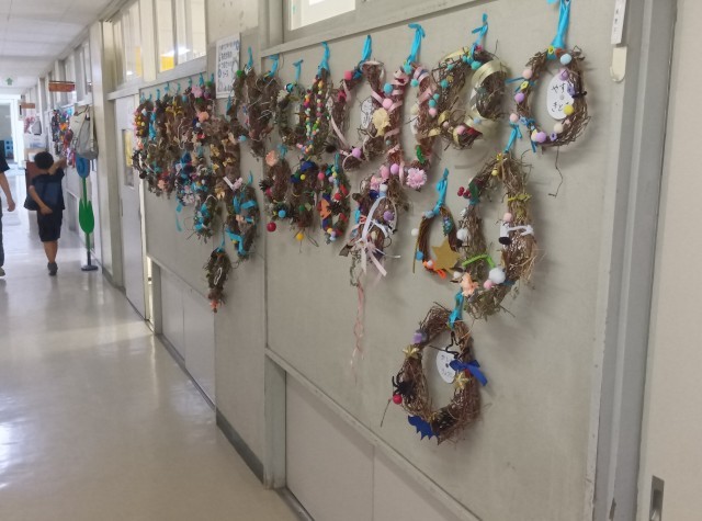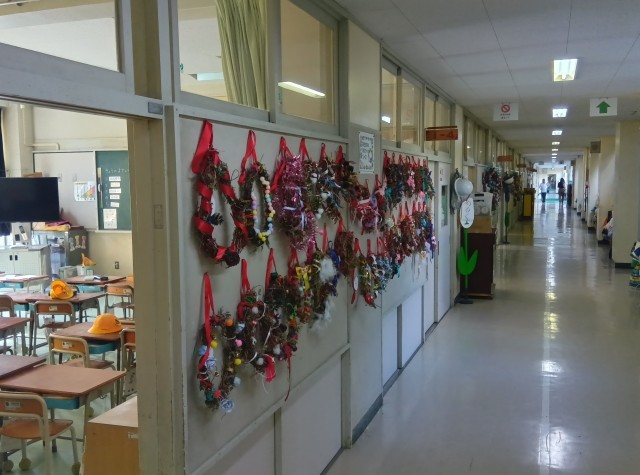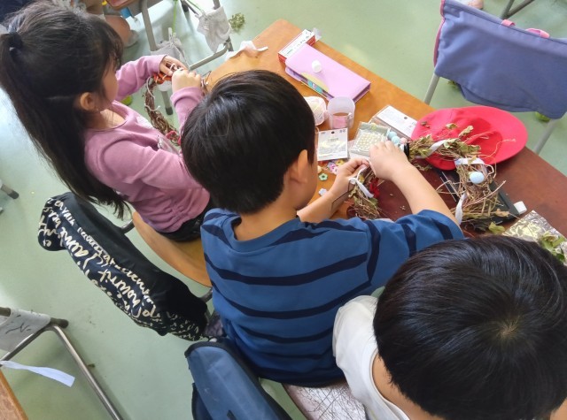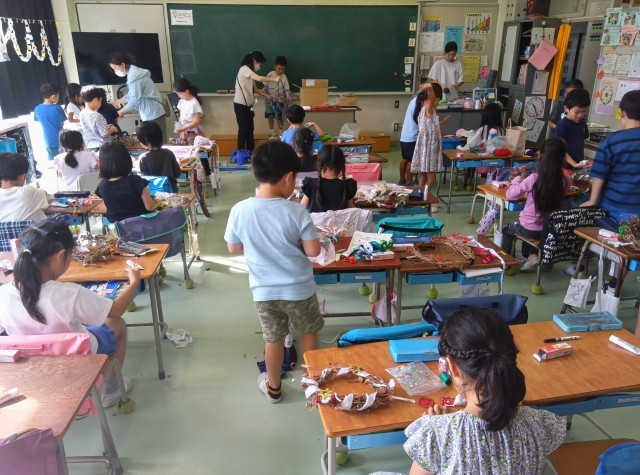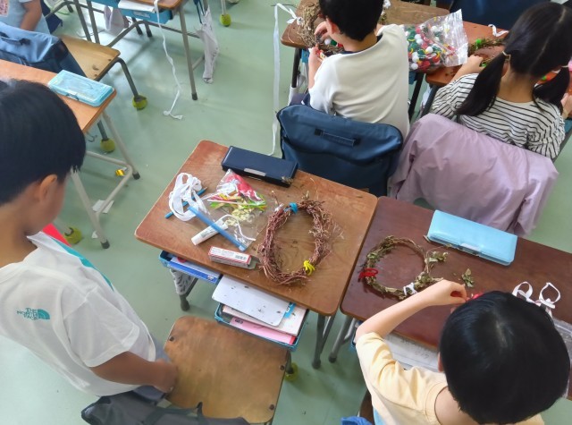1年生がリースづくりに取り組んでいます。輪にしたアサガオのつるに、リボンを結んだりモールや飾りを付けたりしています。友達のリースを見合ったりアイディアを伝えたりして楽しそうです。できあがったリースは教室の壁に飾りました。