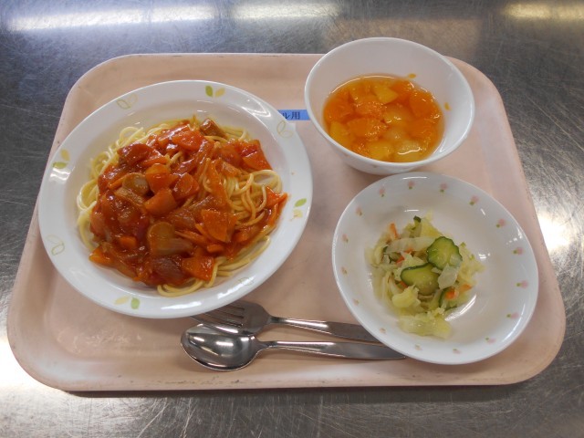 【献立】 牛乳 スパゲティトマトソース キャベツサラダ フルーツポンチ