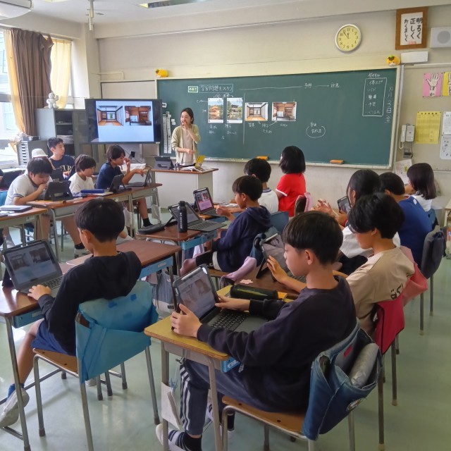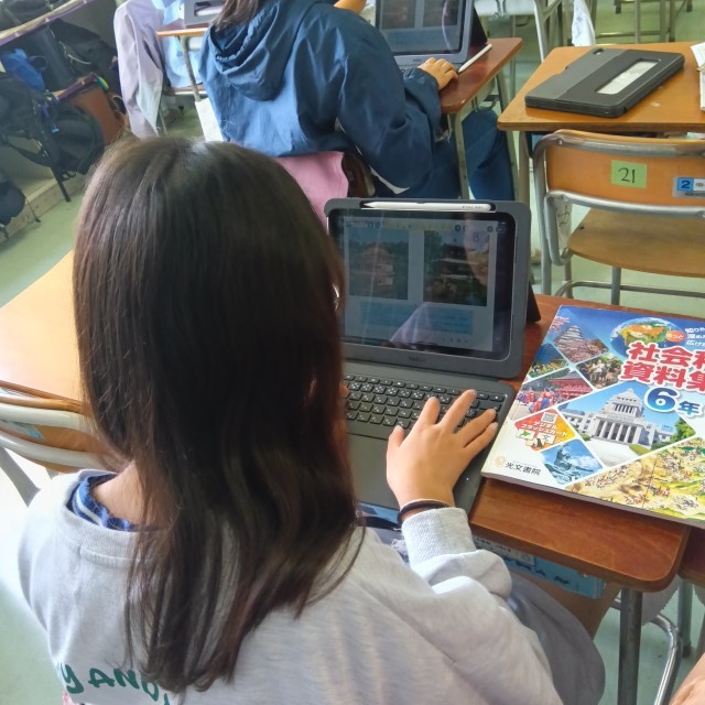 6年生は、社会科で歴史の学習をしています。子どもたちは、金閣寺と銀閣寺や和室の写真を比べてみて、気付いたことを話し合いました。そこから、学習問題をつくり、予想を立てて調べていきます。子どもたちの主体性が光る学習が進められています。