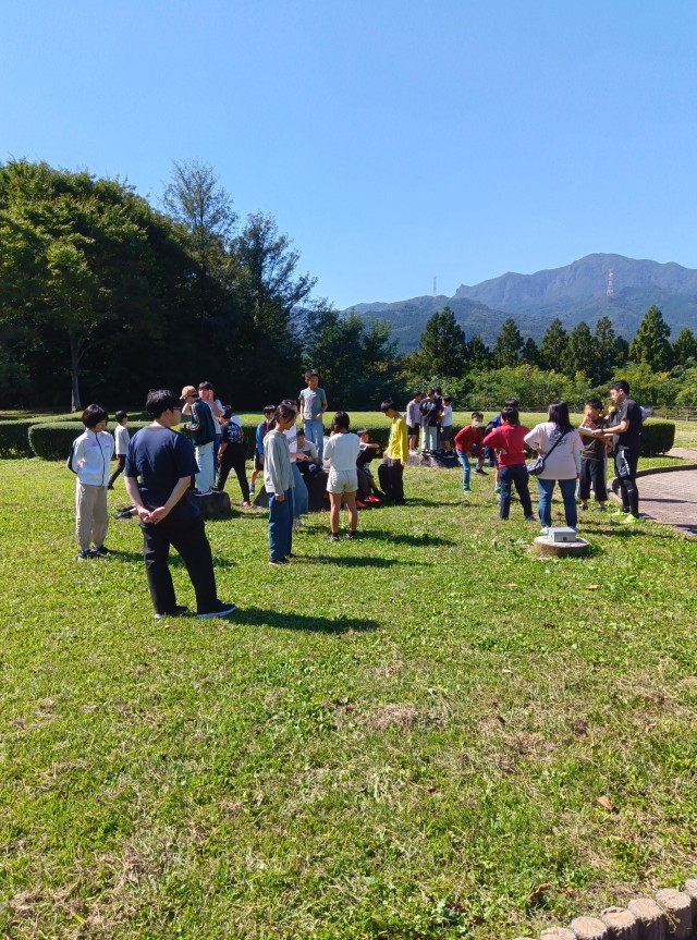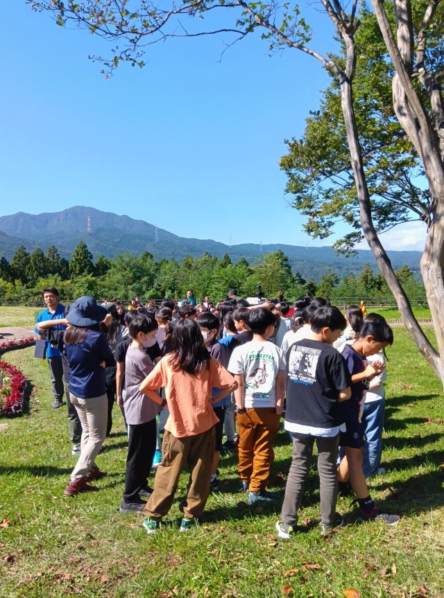 赤城高原サービスエリアに到着しました。クラスごとに集合写真撮影をしています。よい天気で、きれいな景色が見えます。