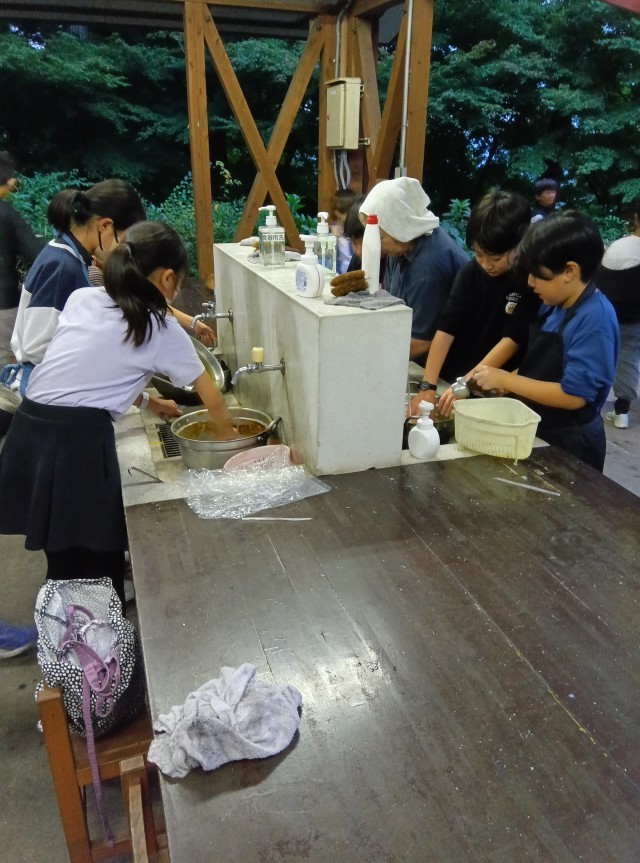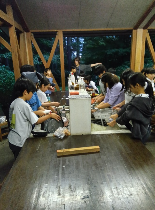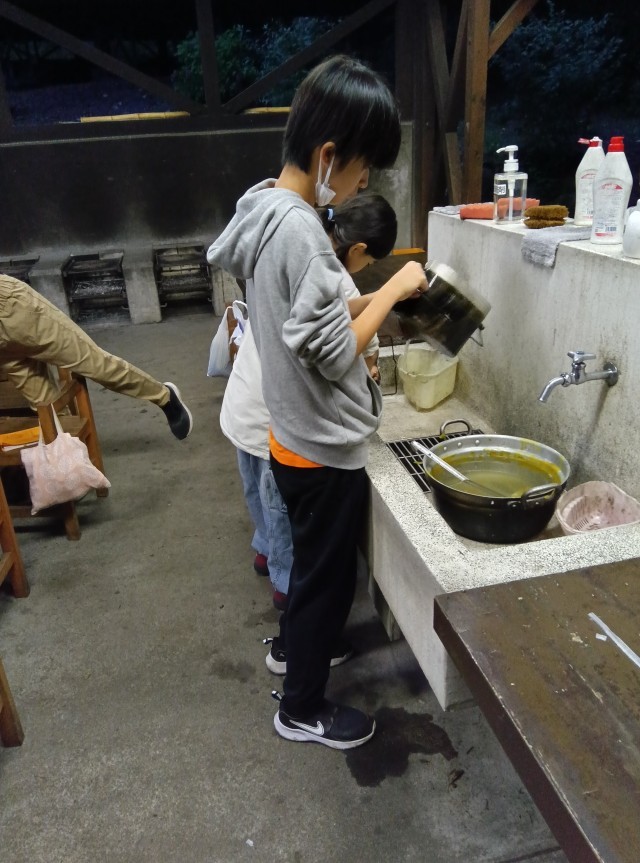 子どもたちは、カレーをおいしく食べて、片付けをしました。なかなかとれない汚れも、頑張って落とそうとしていました。ごみは分別。生ごみブラック、何でもホワイトが合言葉です。これから、キャンプファイヤーが始まります。