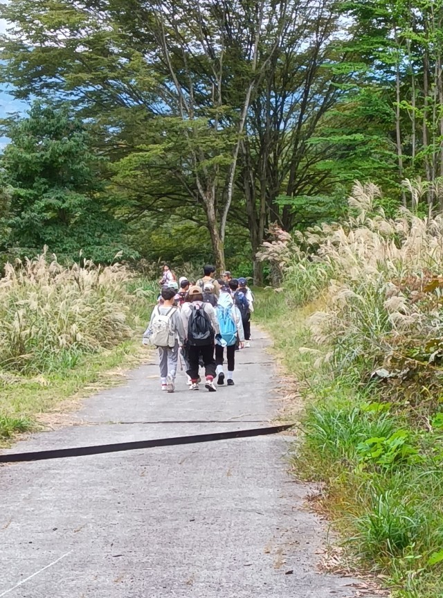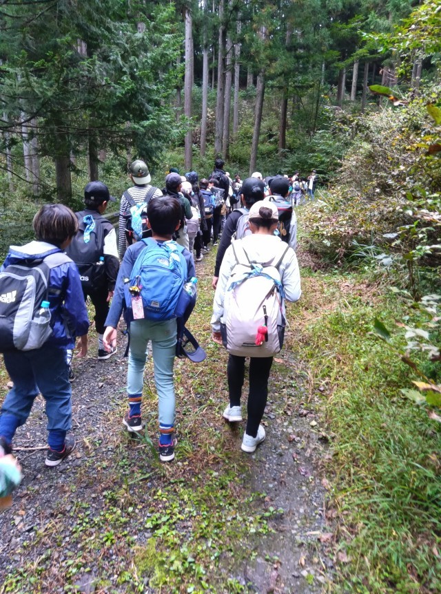 ハイキングに出発しました。子どもつは、「人生初めてのハイキングだ」「すごいきれいな景色」「ヒル、ついてない?」「カニがいた!」などと言いながら、大自然の中を歩いています。今日は涼しいですが、こまめに水分補給をしています。