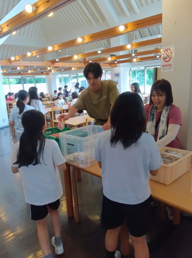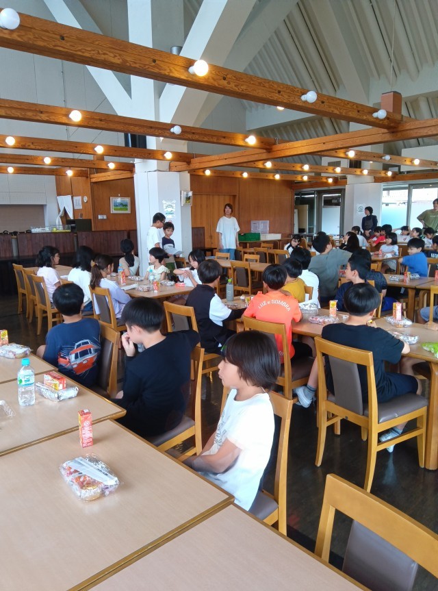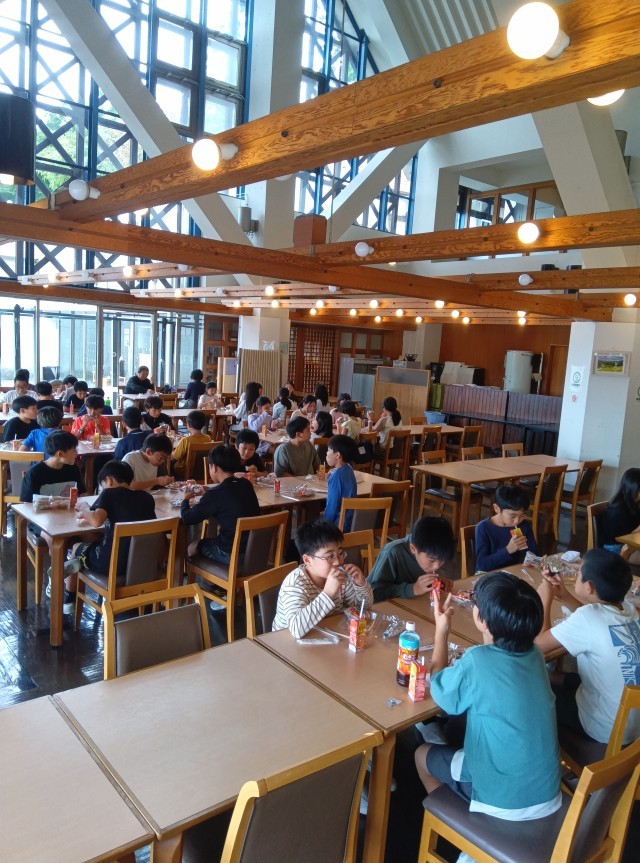 昼食タイムです。食堂で弁当を食べます。子どもたちは、時間前に全班が弁当を受け取って席につきました。すばらしいです!「いただきます」をして、食べ始めました。