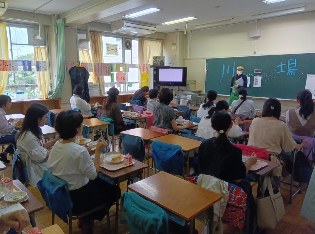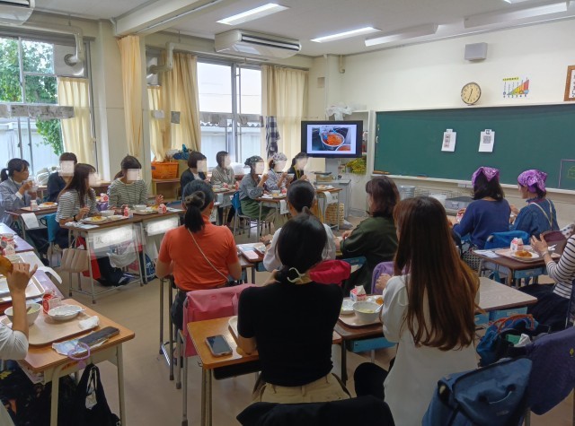 みなさんで配膳を体験し、試食中です。みなさん、美味しく召し上がっていただいている様子です。給食ができるまでの動画もご覧いただきました。