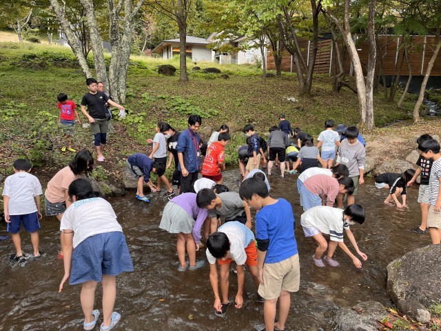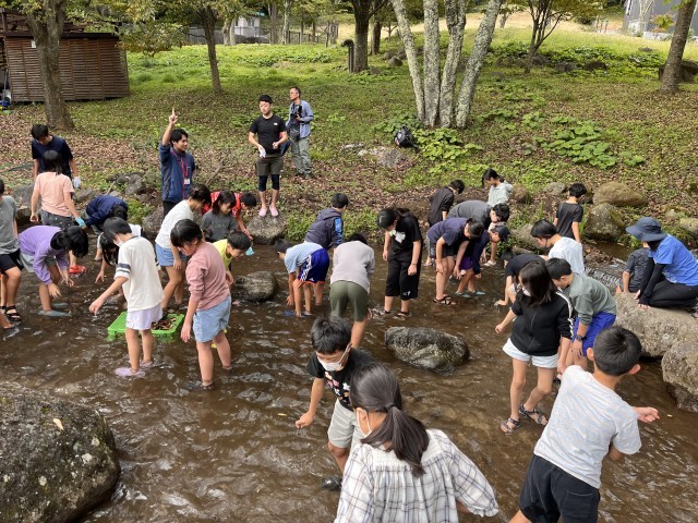 マスつかみが始まりました。ビレジの方に捕まえ方を教えてもらってスタートです。「シッポを捕まえたのに!」「岩の所に追うと捕まえやすいよ」といろいろな気付きがあるようです。待っている時間に、きれいな花を見つけたよと、教えてくれました。