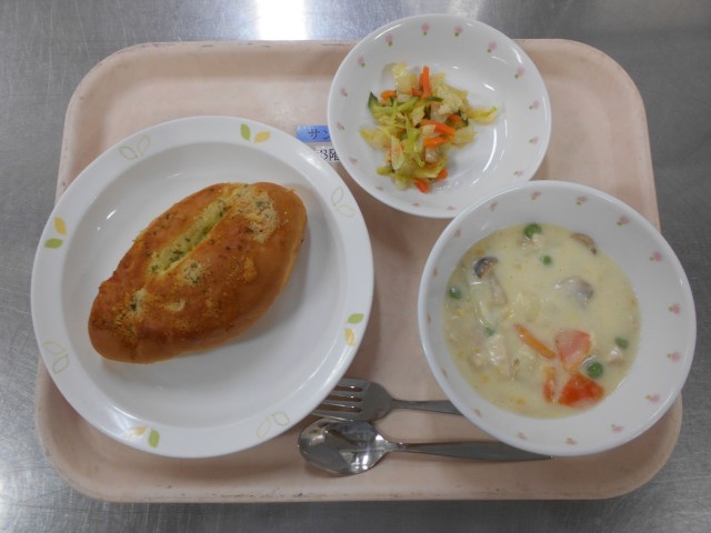 【献立】 牛乳 国産小麦のガーリックフランス 米粉の豆入りクリームシチュー イタリアンサラダ