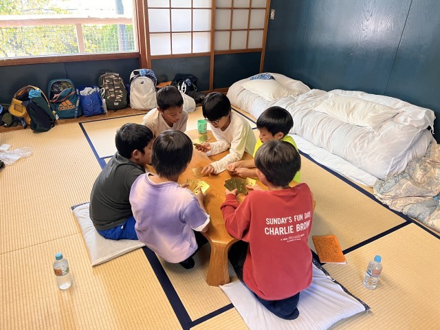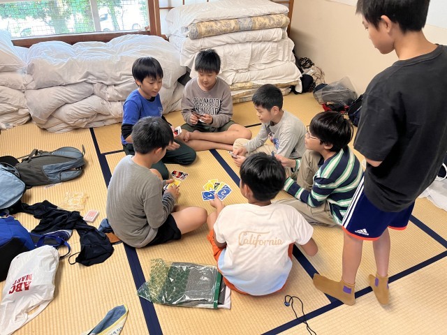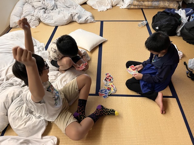 マスつかみを終えて部屋に戻りました。部屋でカードゲームをしたりおしゃべりをしたりして歓声が聞こえます(時々、大歓声も聞こえます)。協力して行動することで自由時間が増えました。すばらしいです。