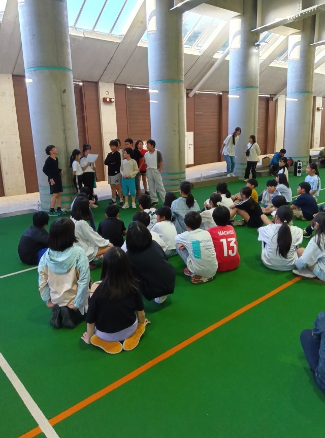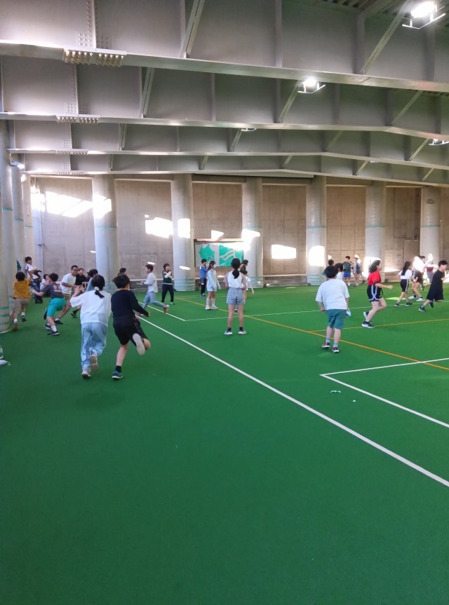 広場での学年レクが始まりました。レク係が準備をしてきました。まずは氷鬼で、子どもたちは元気よく走っています。