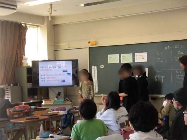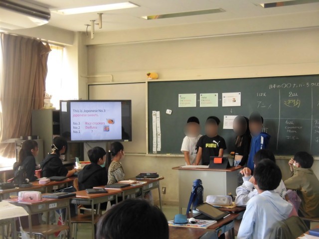 6年生の外国語では「日本のナンバー3クイズ」を行いました。グループに分かれて、日本のアニメ、建物、食べ物、菓子、観光地などのナンバー3を調べました。ナンバー1は何かをクイズ形式にして発表しました。「This is Japanese No.3 japanese sweet!」、「This is Japanese No.3 food!」などなど、自己紹介も含めて英語でしっかりと発表することができました。クイズ大会も時間が足りなくなるほど盛り上がりました。