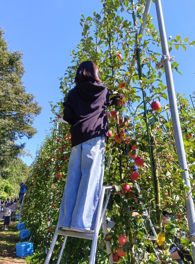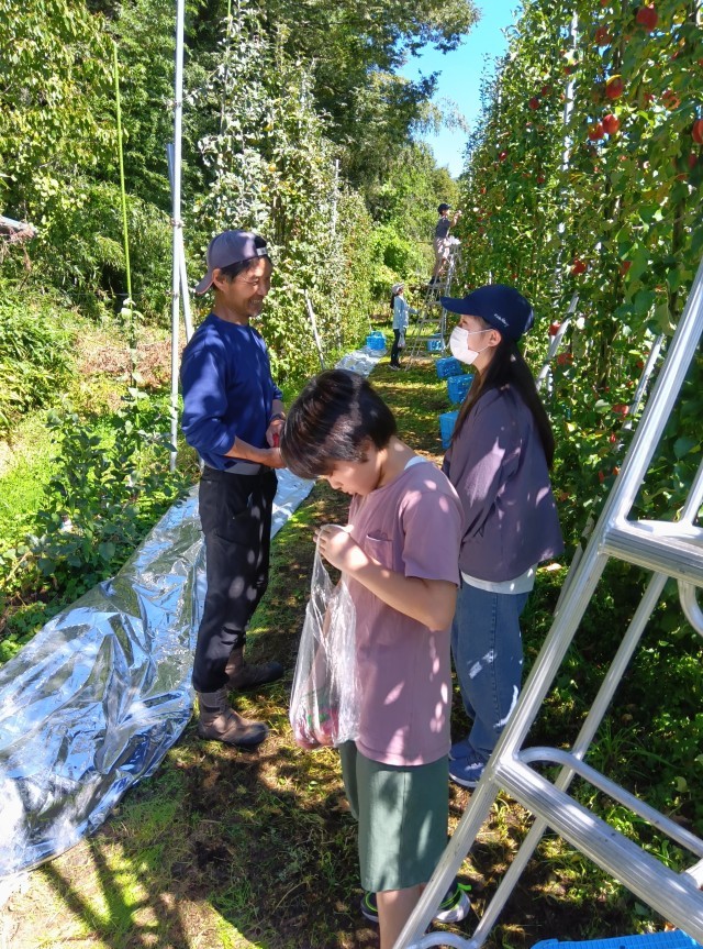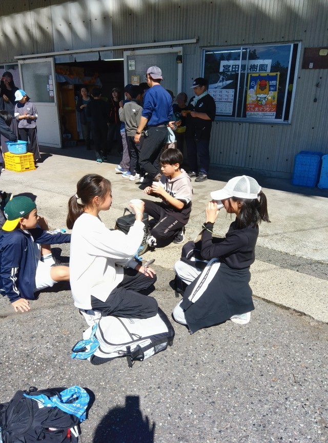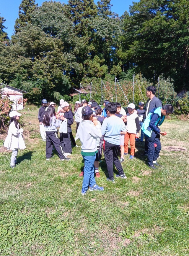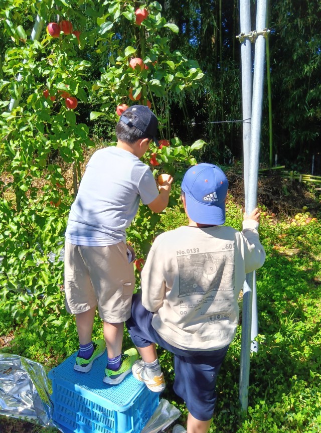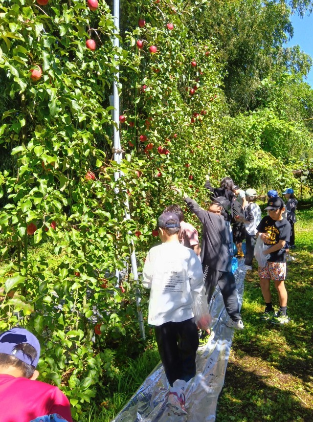 リンゴ狩りが始まりました。りんごのもぎ方にはポイントがあります。子どもたちは、手本を見せてもらってから、慎重に始めています。今日は、あかぎというリンゴを2個持ち帰ることができます。「すごく赤いのがとれた。おいしそう。」「帰ったらすぐに食べたい!」「アップルパイにして食べたい!」などと話しています。ご家庭で、お土産話とともに味わっていただきたいです。最後に、子どもたちは濃厚なリンゴジュースも飲み、満足そうです。