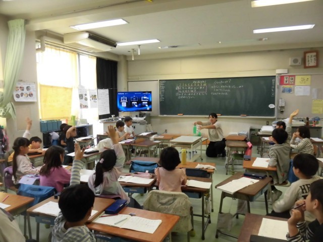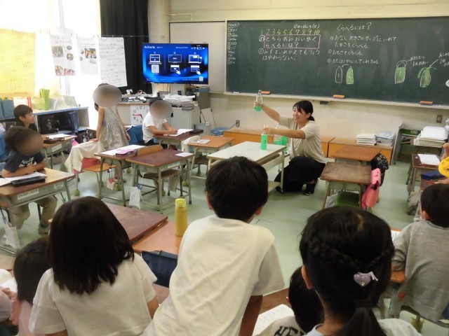 1年生の算数では「どちらがおおい」の学習をしています。今日は形や大きさの違うペットボトルに入っている水のどちらが多いか比べるにはどうしたらいいか考えました。「同じカップに入れかえたら?」「重さをはかったら?」とアイディアがたくさん出ました。実際に実験も行い、興味津々に実験の様子を見る様子も見られ、比べ方にも様々な方法があることがわかりました。