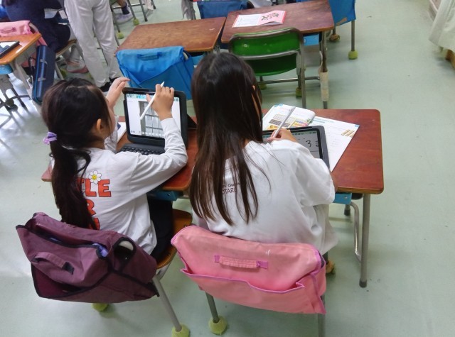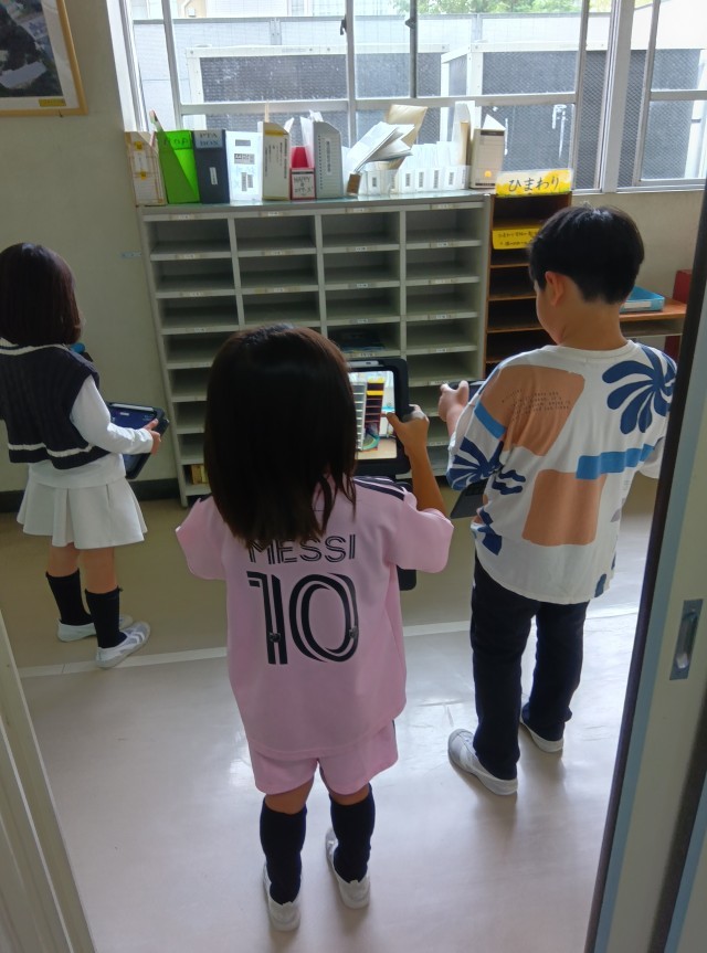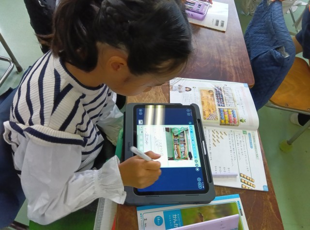 2年生は今、算数でかけ算の学習をしています。子どもたちは、学校の中でかけ算で計算できそうなものを探しました。廊下の掲示物やくつ箱、棚など、多くの発見がありました。子どもたちは、見付けたものをタブレットで写真撮影してワークシートに言葉や式で表し、答えを出しました。「できた!」と嬉しそうに喜ぶ子どもたちの姿が印象的でした。