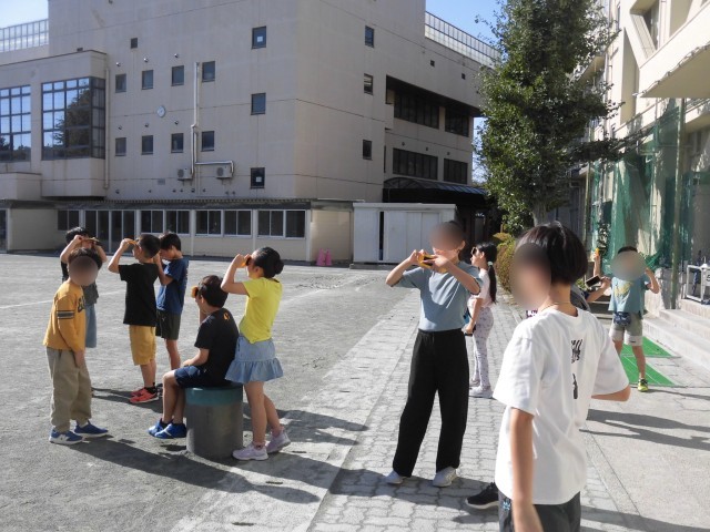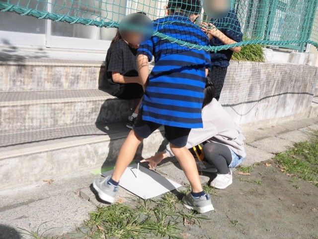 3年生の理科では「地面のようすと太陽」の学習をしています。今日は、校庭に出て、遮光版を使って太陽の観察をしました。直接見ることができない太陽を観察し、「太陽が見えた!」「まん丸だ!」と喜ぶ様子も見られました。また、時間が経つと影の位置がどのように変化するのか調べるために、画用紙に棒を立てて、棒の陰の位置に印をつけました。時間をおいて影の位置がどのように変化しているのか確認します。