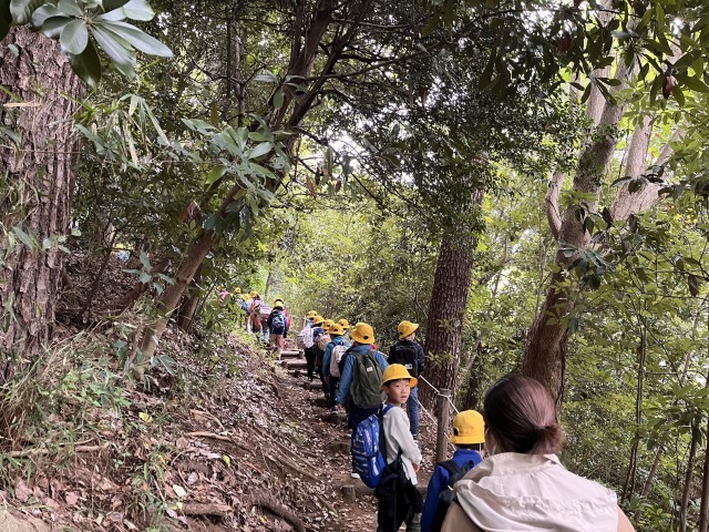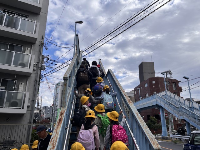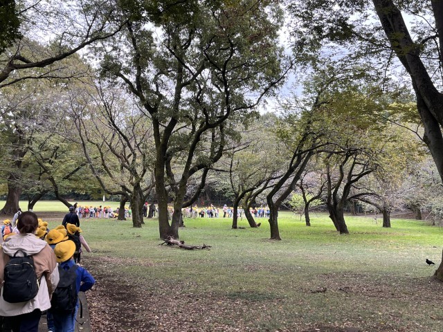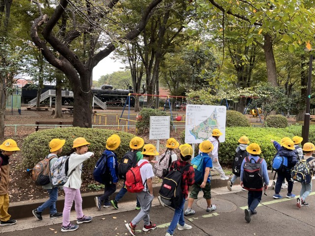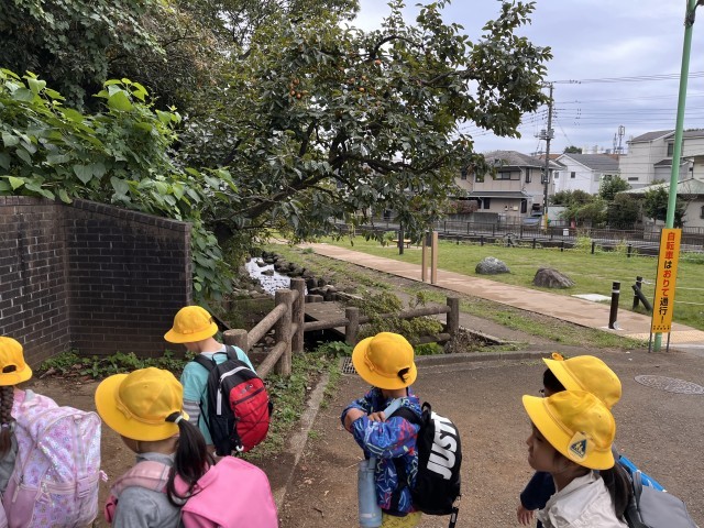 1年生が校外学習に出張しました。行き先は砧公園です。道路を歩く時は、ルールを守って注意して歩いています。感心しました。「秋を探してみよう」と話したら、「柿がなってるよ!」と教えてくれました。他にはどんな秋があるか、楽しみです。
