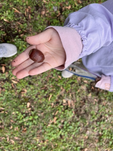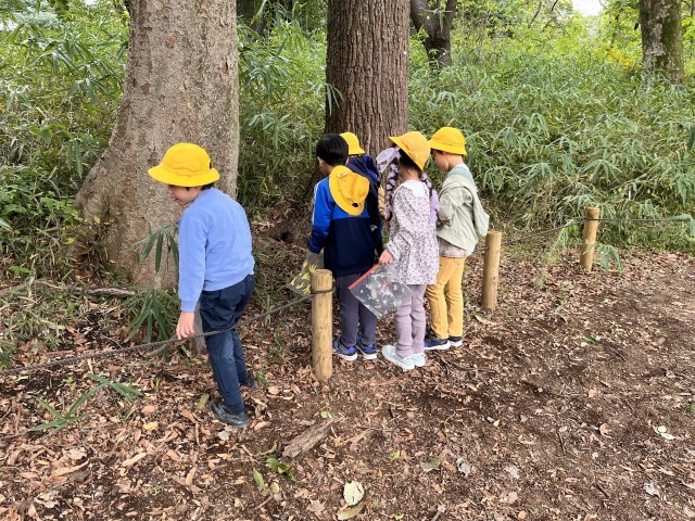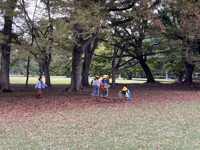 早速、秋探しが始まりました。グループや友達とドングリを拾ったり、きれいな落ち葉を探したりしています。鳥の羽を見つけた子もいます。