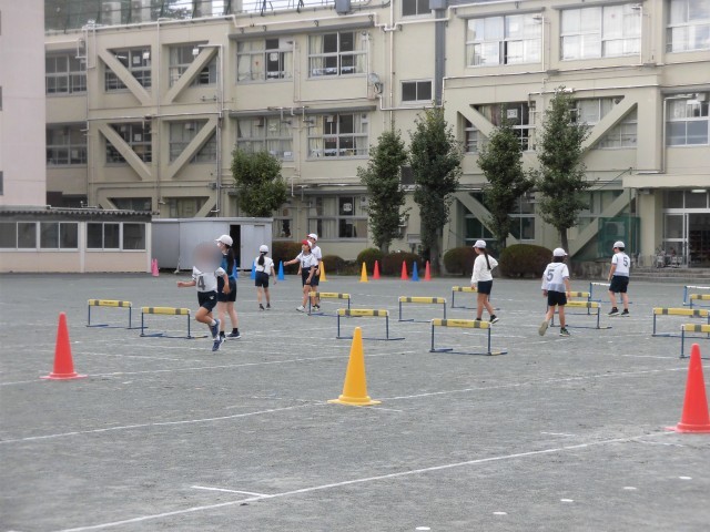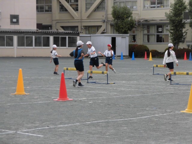 5年生の体育では「ハードル走」の学習が進んでいます。足の踏み切り、跳ぶ時の体勢、リズミカルに跳ぶことなどを意識しながら練習しました。何度も練習することで、コツをつかみ、友だちどうしでアドバイスしあう様子もみられました。リズミカルに次々とハードルを跳ぶ楽しさも味わっているようです。