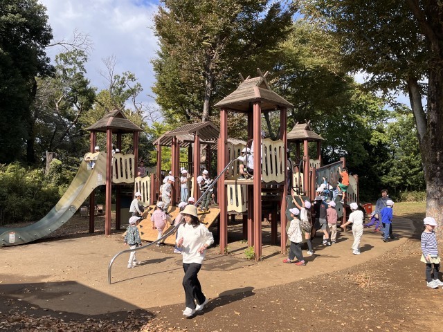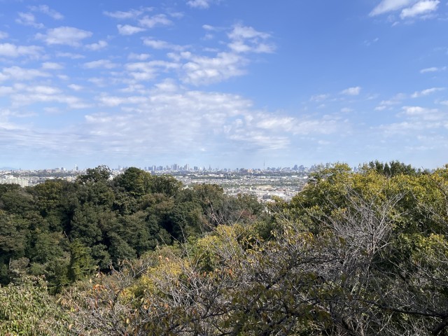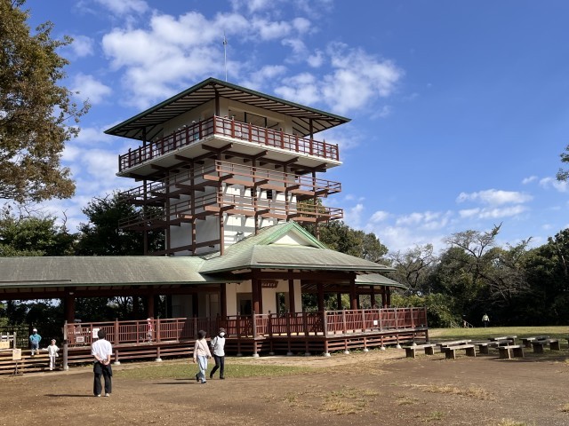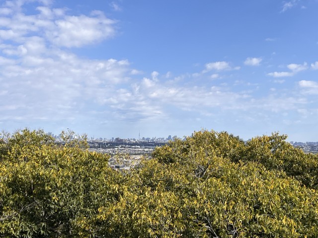 ゴールの枡形山の頂上に着きました。大きな遊具があり、楽しそうです。天気がよく、展望台からは、スカイツリーや都庁、筑波山や富士山が見えています。