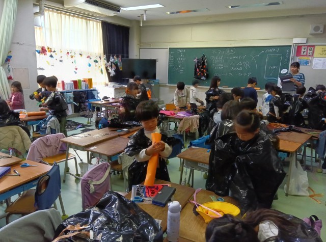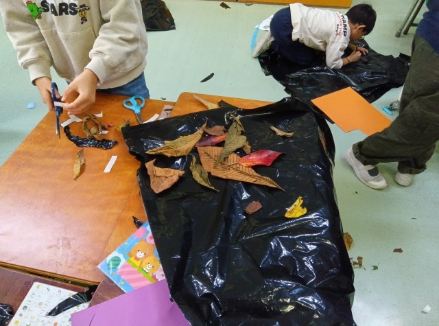 1年生が生活科で、秋の衣装を作っていました。見つけてきた葉っぱやどんぐりを飾って、すてきな衣装ができました。