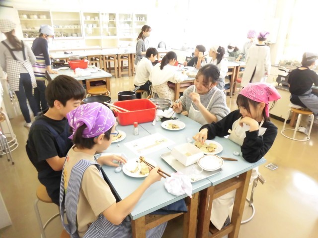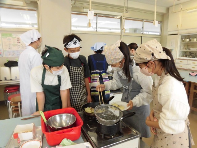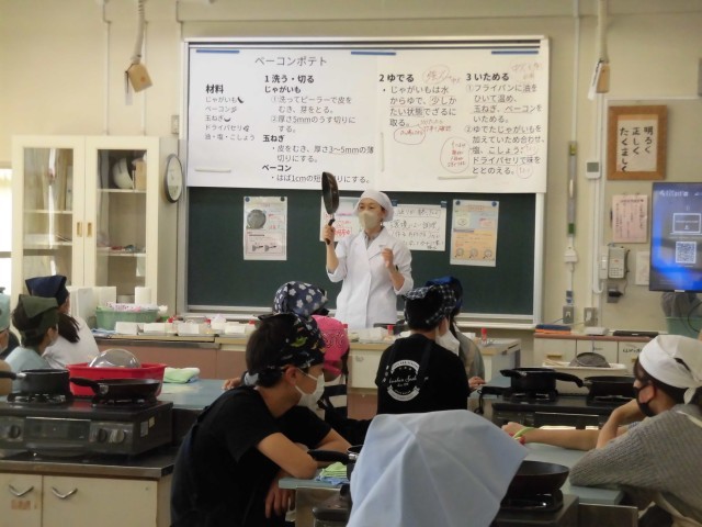 6年生の家庭科で調理実習を行いました。メニューはベーコンポテトです。5年生で調理実習は経験していますが、6年生になって初めてなので、やけどや包丁でのけががないように、使い方や注意事項を確認しました。材料が用意できたら調理スタートです。野菜を洗ったり皮をむいて切ったり、それぞれの班で役割分担を決めていました。ジャガイモを柔らかくなるまでゆでるためには時間がかかります。待ちきれなくて菜箸でかき混ぜてみたり竹串を何度も刺してみたりする様子が見られました。ベーコンと玉ねぎを炒め始めると家庭科室中にいい匂いがし始め、「おなかすいた!」「早く食べたい!」と声が上がりました。塩こしょうで味つけをし、パセリを飾るとおいしそうなベーコンポテトが完成しました。班のみんなでいただきますをして食べ始めると、「おいしい!」「「おかわり食べたい。」とにこにこして、あっという間に食べ終わりました。油で汚れたフライパンや皿は、あらかじめふき取ってから洗うという環境に配慮した片付け方法も学び、今日の実習は終了しました。