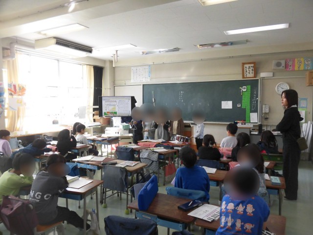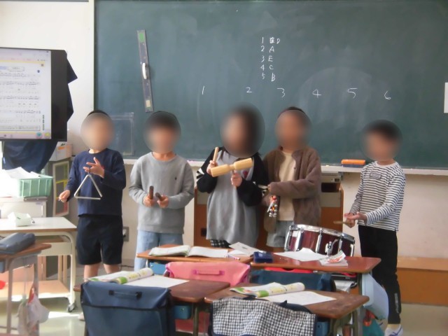 2年生の音楽では、いろいろな楽器を使って演奏を楽しんでいます。トライアングル、クラベス、すず、小だいこ、ウッドブロックなどの打楽器の音をかさねて、「かぼちゃ」の歌にあわせて演奏し、グループごとに発表しました。それぞれの楽器の音をよく聞いて、順番に音をかさねていったり、全員でリズムをあわせて演奏しました。歌詞の様子を思い浮かべ、弱い音や強い音など強弱をつけながら演奏することができました。大きな歌声と打楽器の音で、とても楽しい音楽になりました。