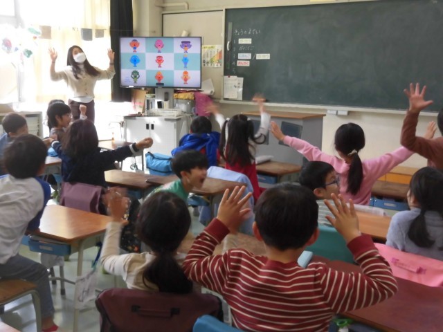1年生の外国語の授業は元気な歌で始まります。「Hello,How are you?」を歌いながら友達どうし挨拶をして、じゃんけんをします。手拍子をしながら自分の気持ちや、虹の七色を英語で表す歌が続き、子どもたちの声もいっそう大きくなり、躍りだす子も出てきます。