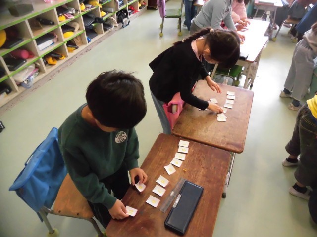 今日のメインの学習は「数」の表し方です。初めにみんなで発音した後は、ゲームでさらに楽しく学びました。10までの数字が書かれたカードを机にばらばらに置いて、30秒で読み上げながら並べ替えます。「Ready,go!」のかけ声でみんな素早く並べ替えていました。裏返した状態からスタートするという難しいミッションの時には、子どもたちの集中力が一気に高まりました。最後は1から5までの数字を並べ、両端からじゃんけんで勝った方が進むことができるという対戦型のゲームをしました。今日いちばんの盛り上がりを見せ、代表の二人を応援する声が教室中に響きました。45分があっという間に感じられる授業でした。