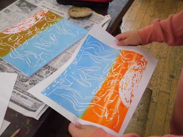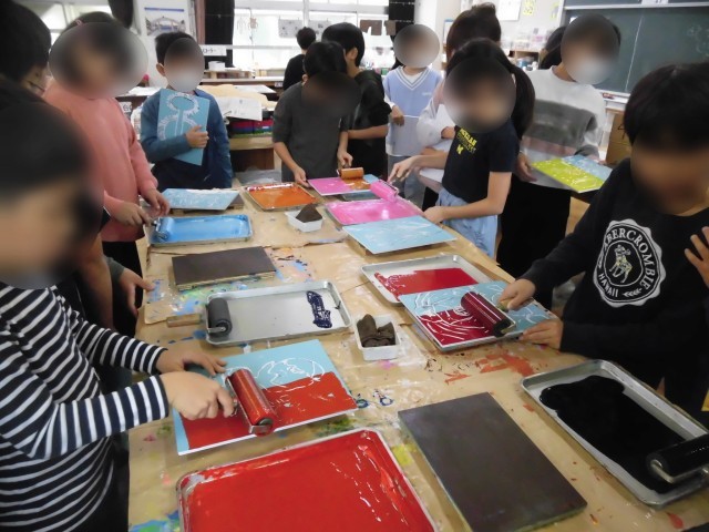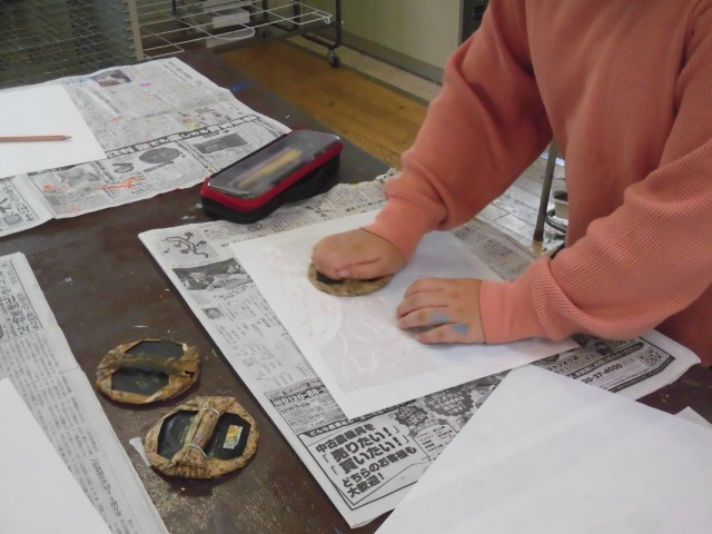 4年生の図工では「彫って表す不思議な花」の作品を制作しています。彫刻刀で彫った版が出来上がり、今日は図工室でインクをつけて刷りました。ローラーで端までしっかりと丁寧にインクをつけたり、ばれんを紙の上でを丁寧に動かして刷る様子が見られました。真剣な眼差しで一生懸命に取り組むことができました。初めてできた作品にはどれも不思議なきれいな花が咲きました。出来上がった作品を見て、笑顔があふれていました。