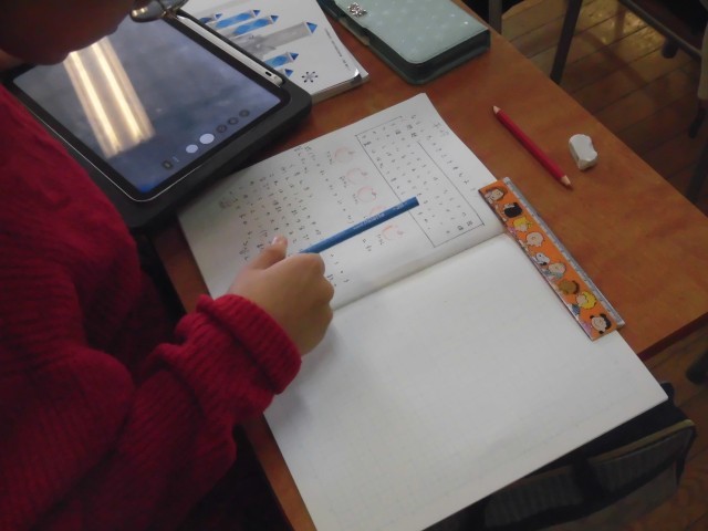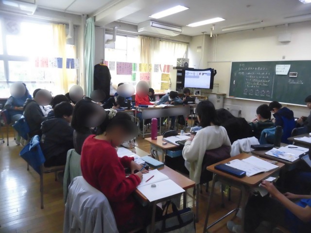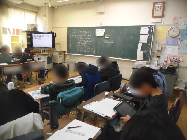 5年生の算数では「平均」の学習をしています。例題として、5個のリンゴを絞ってできたリンゴジュースの量をもとに、1個から絞ることができる量を考えました。「平均」の意味を考えて、平均値の求め方を考えました。ひとりひとりがノートに考え方をまとめ、まわりの友だちと求め方について話し合うことで、より理解を深めることができたようです。