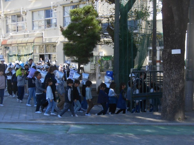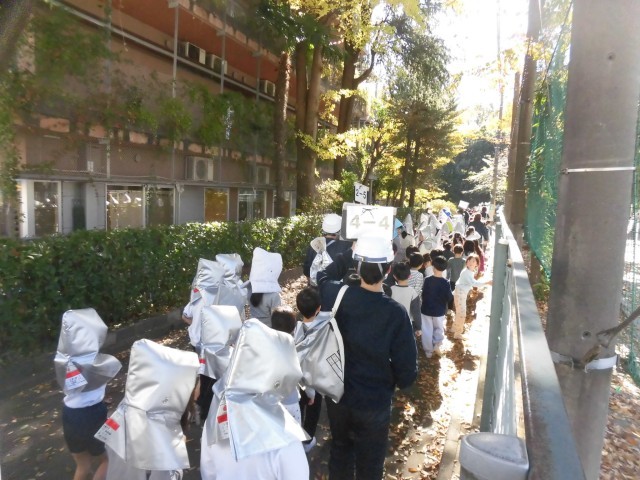 本日3時間目に避難訓練を行いました。地震では、地割れが生じ校庭に避難できないことも考えられます。そのような場合の避難方法を実践しました。避難開始の指示を聞くと、全校が東門と南門から2次避難場所である里山へ向かいました。途中「おかしも」の約束を守り、歩行者や車両の通行にも気をつけながらの移動となりました。11月の学校だよりに主幹教諭の東日本大震災時の経験談を掲載しました。災害時に起こり得る様々な危険を想定し訓練をしておくことが、とっさの行動に活きてきます。本校でも毎月の避難訓練に真剣に取り組んでいきます。