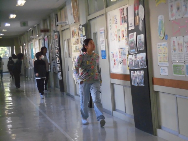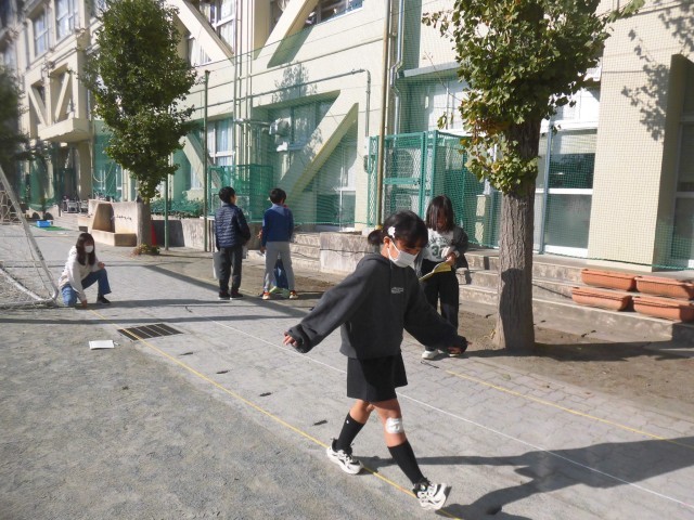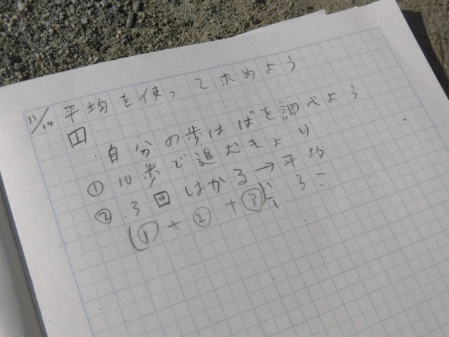 5年生は、算数で「平均」の学習をしています。10歩で進む距離を実際に歩いて測り、そこから自分の歩幅がどのくらいかを計算しました。より正確な数字を得るために「さりげなく」歩くことがポイントです。また3回計測することで精度を上げました。結果を見せてもらうと、だいたい同じような距離となっていました。教室でそれぞれ平均値を計算したあと、自分の歩幅が分かるとできることについてさらに考えました。「測量!」とすぐに答えが返ってきたことには驚きました。残りの時間で校内のいろいろな場所を測りに出かけました。子どもたちは、校長室から自分の教室までや体育館の渡り廊下など、思いつくままに測り、歩幅を使って距離を知ることを実感しているようでした。