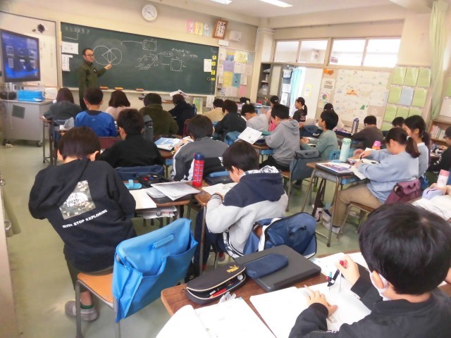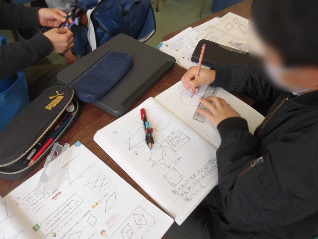 4年生の算数では「垂直・平行と四角形」について学習しています。今日は、四角形の仲間の「ひし形」について学習しました。ひし形の辺の位置関係や構成からひし形の特徴を考えました。コンパスを使って円を二つ書いて、ひし形を作図する方法も学び、ノートに書きました。「本当だ!ひし形ができた!」と驚く様子も見られました。作図するだけではなく、なぜコンパスで円を二つ書くことでひし形ができるのかについて考えました。
