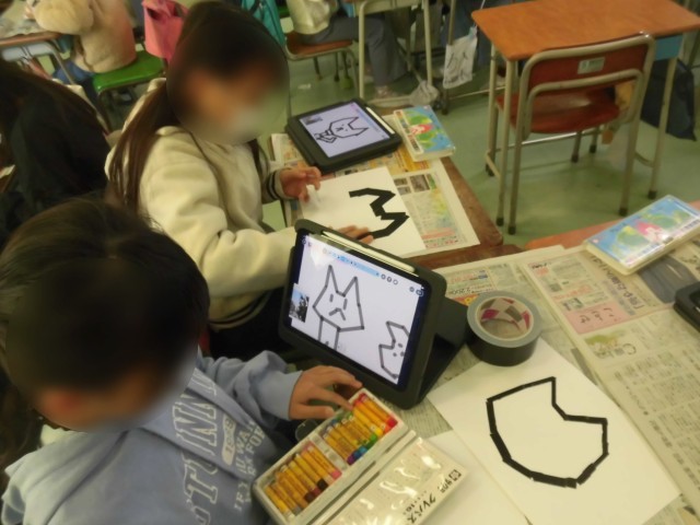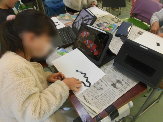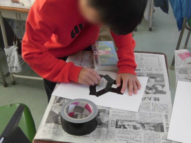 4年生の図工で「ガムガムワールド」の作品の制作が始まりました。好きな動物や生き物をガムテープを使って作り、クレパスで色をぬります。タブレットを活用して、自分の好きなデザインを考えました。ガムテープを細く切るのに苦戦する様子も見られましたが、徐々にコツをつかんで、作ったデザインを見ながらガムテープを貼りました。こすってぼかしたり、点で描いたり、二重に線を描いたり、様々なクレパスの技を使いました。次回の本番に向けて、ガムテープの貼り方やクレパスの塗り方にどのような工夫ができるのか学習しました。