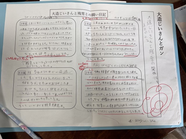 5年生は国語で物語文「大造じいさんとガン」を学習しています。長い間、国語の教材として活用されてきた物語です。今回は、大造じいさんの気持ちの変化について考えていました。日記のようにまとめたり、気持ちの変化をグラフにしたり、大造じいさんがインタビューを受けているようにしたりと考えていました。これから、それぞれの子どもがの考えを共有し、考えを深めていきます。