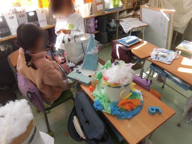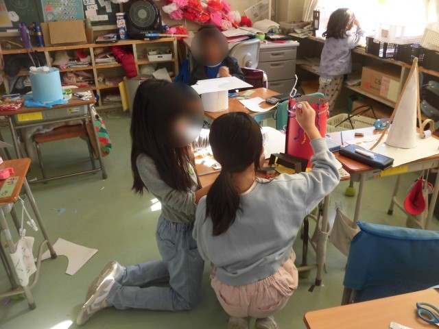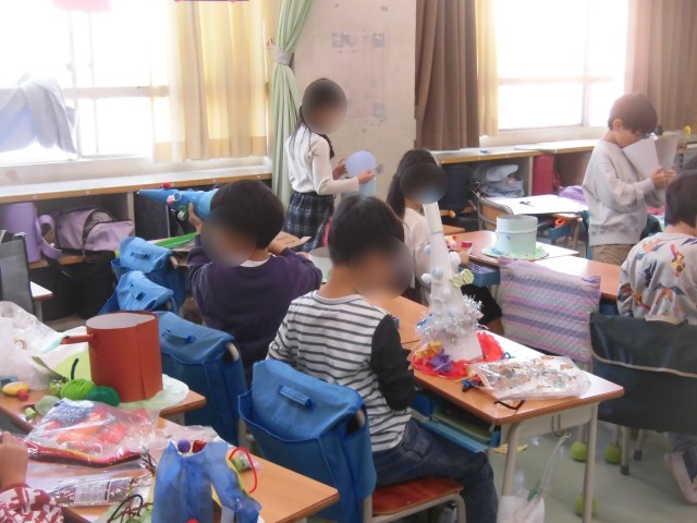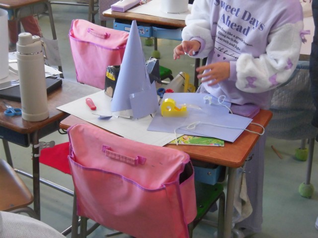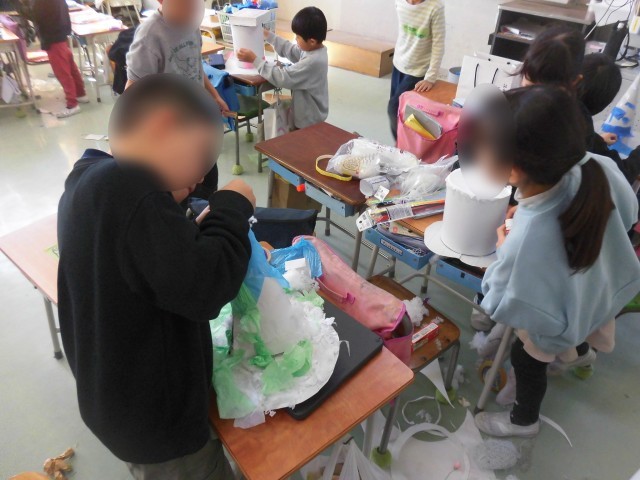 2年生の図工では「わたしのすてきな帽子」作りをしています。筒形、コーン形、ドーム形などの好きなタイプの形を選んで帽子を作ります。画用紙で形を作ったら、飾りつけです。画用紙を丸めたり、形作るのに苦戦する様子も見られましたが、友だちと協力しながら取り組む様子もありました。花がみ、ビニールひも、布、モールなどを使って飾り付けました。海や森などをイメージしながら飾りつけをしました。世界に一つだけのすてきな帽子が出来上がりました。