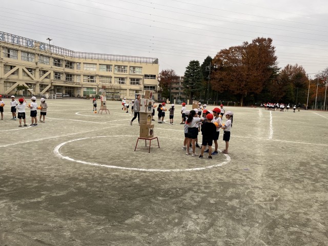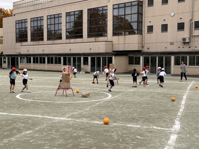 寒い朝でしたが、1時間目から1年生が元気に体育で活動していました。ボールを投げて、的に当てるゲームです。一人一人のゲームではなく、グループで協力して競っていて楽しそうです(グループで元気に掛け声をかけています)。楽しみながら、狙った所にボールを投げる技能を身に付けていきます。