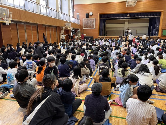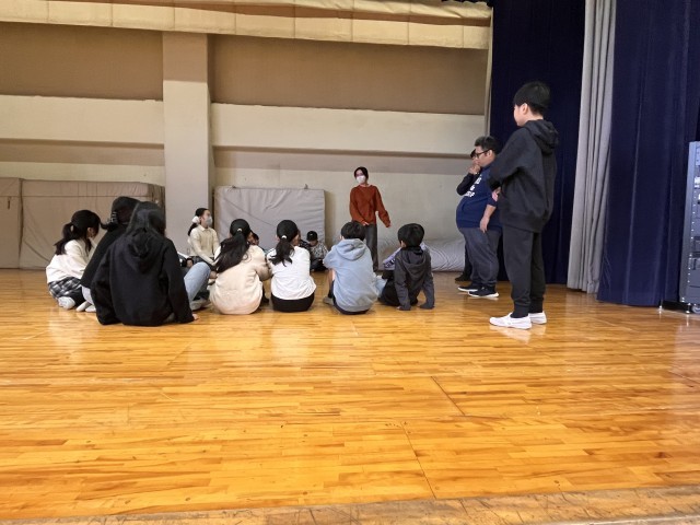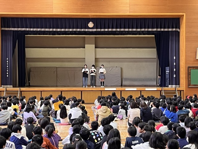 集会委員の皆さんが「ジェスチャーゲーム」を計画してくれました。動物の鳴き声等を聞いて、真似をします。いろいろな動きがあって、おもしろかったです。特に、侍の刀やピストルの音は盛り上がりました。集会の後は、反省をして、次回に備えています。楽しい集会をありがとうございました。