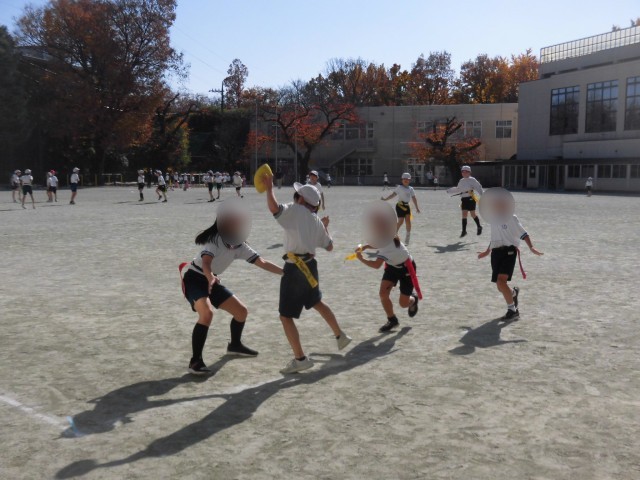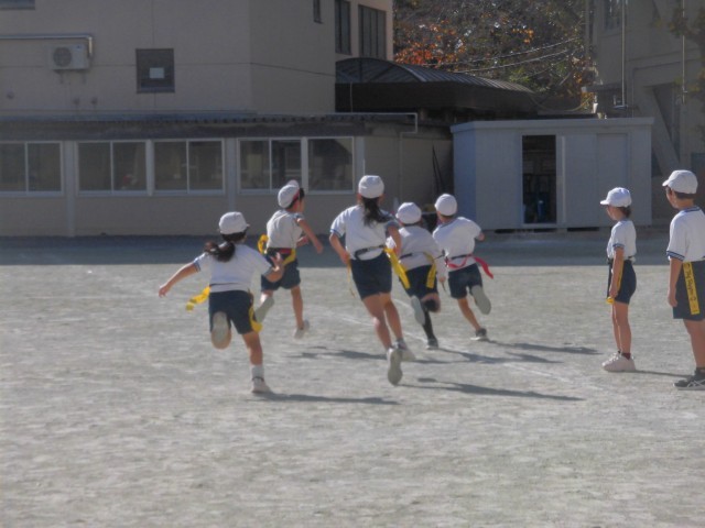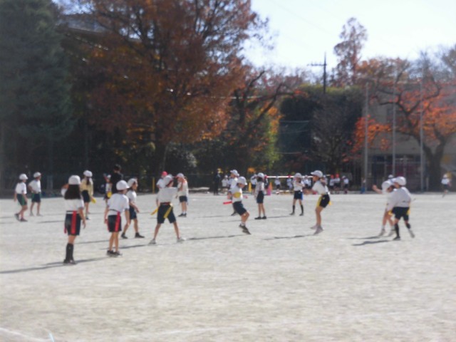 3年生の体育では「タグラグビー」の学習が始まりました。ルールをしっかりと学習した後、さっそくチームに分かれて試合を行いました。腰につけたタグベルトを相手チームに取られないように、楕円形のボールをパスしたり、ボールを持ったらそのまま走りぬいてゴールを目指します。チームで声を掛け合い、楽しく取り組むことができ、とても白熱した試合になりました。