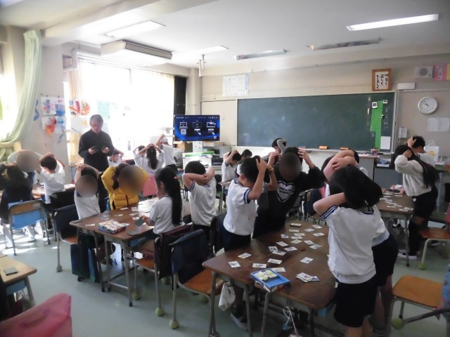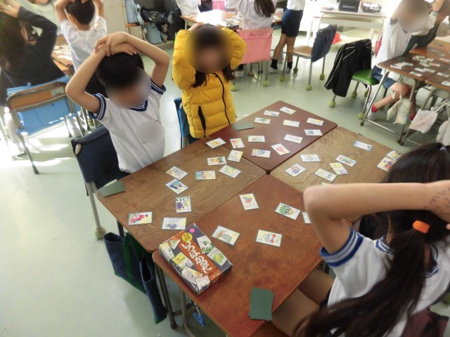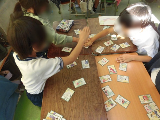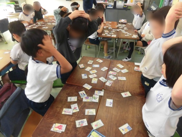 2年生の日本語では昔から伝わる日本の遊びについて学習しています。今日は、「江戸いろはかるた」に親しみました。先生の読み札を読む声を真剣に聞き、机の上の取り札をじっと見つめ、とても緊張した空気に包まれていました。「やった!」「とれた!」と大喜びする様子が見られました。歴史的かなづかいの「ゑ」や「ゐ」にもふれることができました。かるたで遊びながらことわざや言葉の意味について学習できたようです。