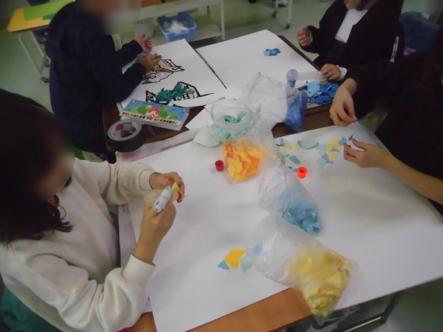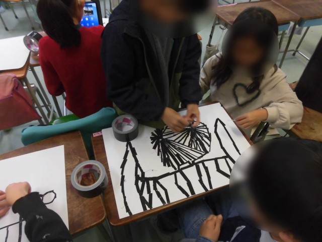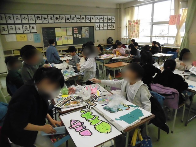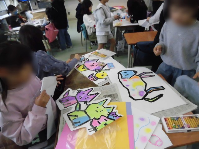 3年生の図工では「ガムガムワールド」の作品制作が進んでいます。自分の表したい生き物を鉛筆で下書きし、細く切った黒のガムテープで枠取りします。ガムテープを細く切るのを協力しながら作業する様子も見られました。枠取りが終わったら、クレバスでカラフルに色塗りをして、思い思いの生き物が生まれました。ティッシュペーパーでこすってぼかすなどの技法もうまく使うことができました。画用紙に背景も描き、ガムガムワールドの生き物を貼ります。