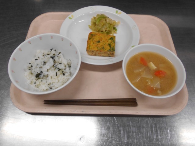 【献立】 牛乳 わかめごはん 千草焼き キャベツとちくわのおかかあえ 具だくさんみそ汁