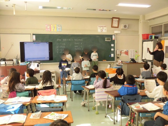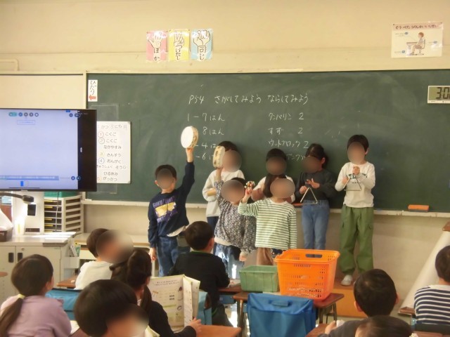 1年生の音楽では「楽器となかよくなろう」の学習で、打楽器の演奏をしました。タンバリン、すず、ウッドブロック、トライアングルの楽器から、好きな音色の楽器を選びました。「さがしてみよう ならしてみよう」の曲に合わせて「タン・タン・タン」のリズムで打楽器をならしました。曲にあったならし方や、自由にならす時とならし方など、さまざまなならし方を考えて練習し、グループごとに発表しました。ちょっと緊張した様子も見られましたが、みんなの大きな歌声にあわせて、楽しく上手に演奏できました。