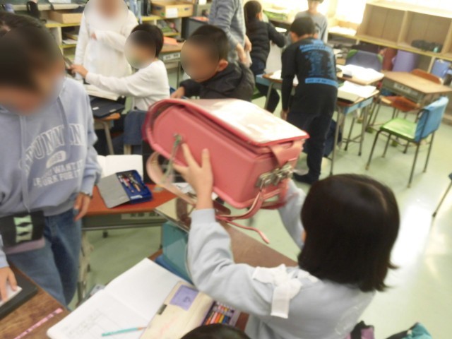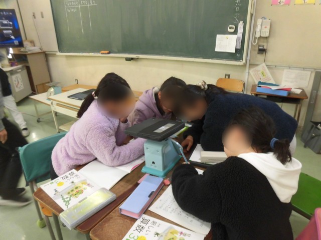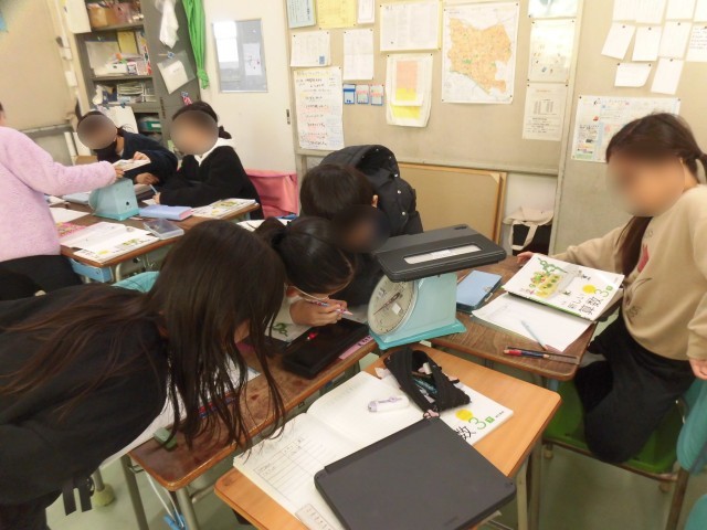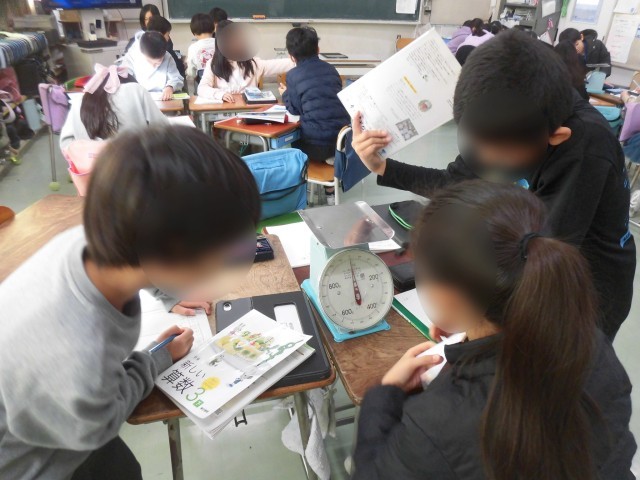 3年生の算数では「重さの単位とはかり方」について学習しています。今日は、はかりを使って、身の回りのものの重さをはかりました。教科書、筆箱、三角定規、ノート、タブレットなどいろいろなものをはかりにのせました。どれくらいの重さか予想をたててからはかりました。「わぁ、思ったより重い!」とびっくりする様子もみられました。はかりの目盛りの読み方や、グラム(g)やキログラム(㎏)の重さの単位についても理解を深めました。ランドセルの重さをはかってみたグループもあり、「重すぎるー!」と声があがっていました。楽しく実験しながら学習を進めることができました。