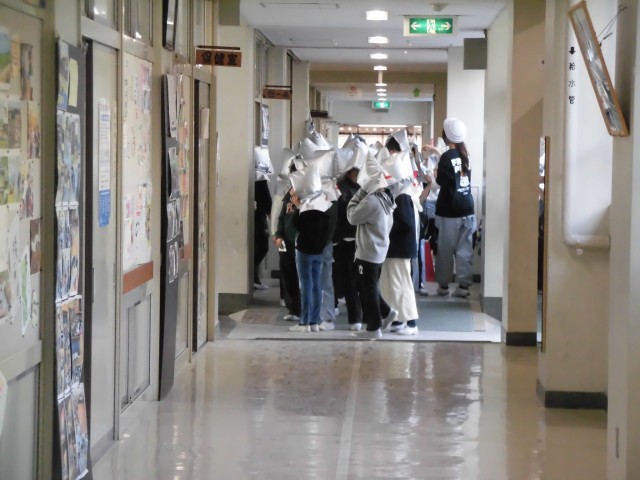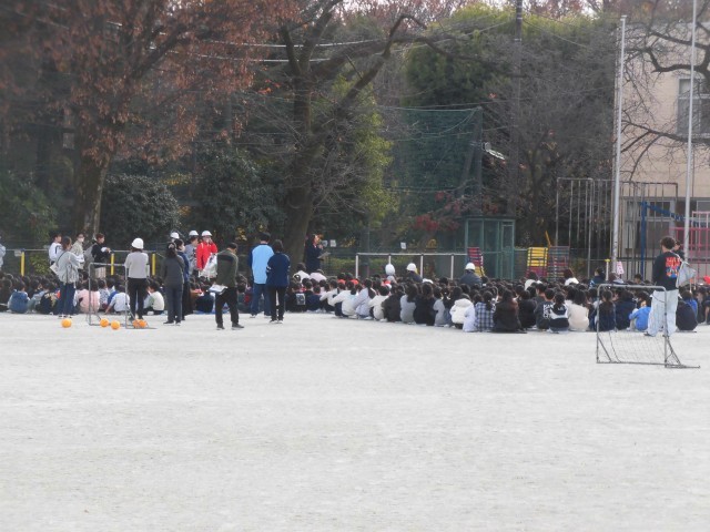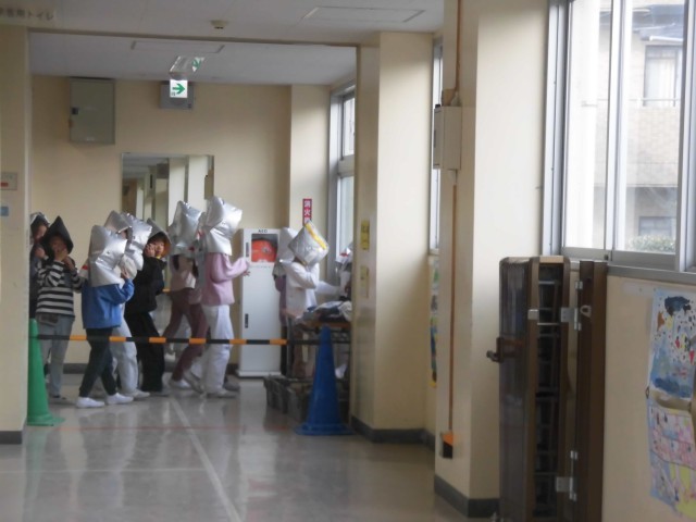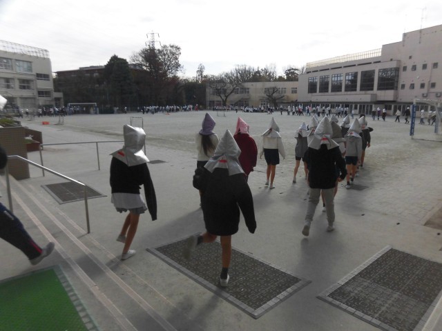 今日は12月の避難訓練が実施されました。家庭科室から出火し、校内の各防火シャッターが下りたという想定で避難訓練をしました。防火シャッターが下りているときの避難経路を考え、防災頭巾をかぶり、身を低くして、ハンカチ等で口と鼻を覆い校庭に避難しました。「おかしも(押さない・駆けない・しゃべらない・戻らない)」の約束を守り、落ち着いて速やかに避難することができました。各クラスでは、防火シャッターの場所や避難扉の確認も行うなど、ふりかえりもしっかり行いました。
