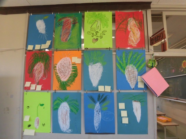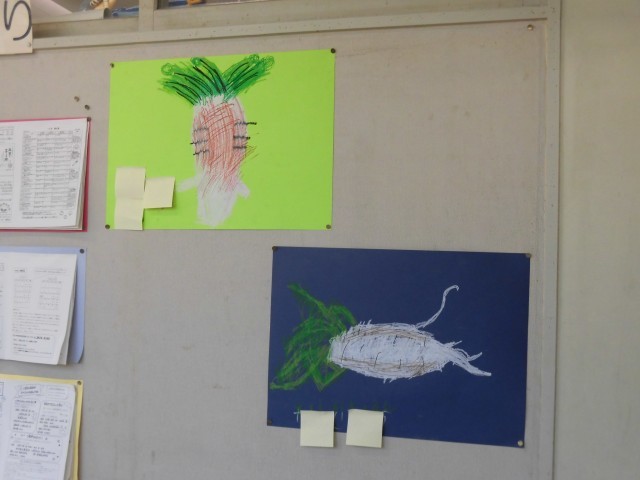 ひまわり学級の掲示板には、今大根の絵が飾られています。先日みんなで抜いてきた大根をモデルにしました。どの作品も紙いっぱいに堂々と描かれています。色画用紙に描いているため、大根の白がいっそう映えて素敵な仕上がりです。白い色もただ真っ白ではなく、様々な色を塗り重ねているため、絵に立体感や奥行きを感じます。対象を細かく見て工夫を凝らしたことが伝わってきました。全身を使って一生懸命に抜いたこと、上手に抜けたときに嬉しかったことなどを思い出しながら描いたのかもしれませんね。